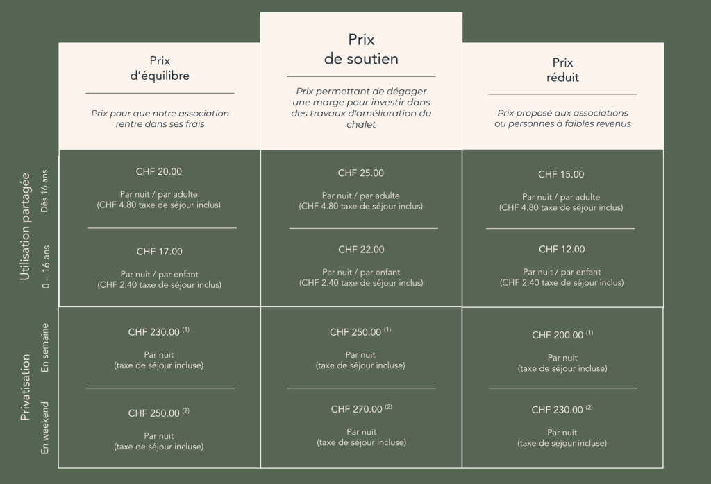 Voici un tableau indicatif des prix de l’utilisation de l’ermitage. Nous te laissons choisir le prix qui te semble le plus juste dans ta situation. Les revenus provenant de l’utilisation sont dédiés exclusivement à la couverture des frais de fonctionnement de notre association et aux quelques travaux de rénovation visant à pérenniser l’utilisation du lieu. Notre activité est à but non-lucratif et exclut toute forme de commerce.