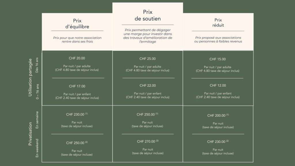 Voici un tableau indicatif des prix de l’utilisation de l’ermitage. Nous te laissons choisir le prix qui te semble le plus juste dans ta situation. Les revenus provenant de l’utilisation sont dédiés exclusivement à la couverture des frais de fonctionnement de notre association et aux quelques travaux de rénovation visant à pérenniser l’utilisation du lieu. Notre activité est à but non-lucratif et exclut toute forme de commerce.